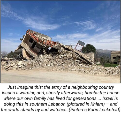 To understand the situation, one really ought to listen to Israeli politicians. Israeli Defence Minister Israel Katz recently declared on Easter Sunday that Israel would occupy the entire Lebanese territory south of the Litani River. All villages in the area along the border with northern Israel would be “completely razed to the ground”, according to Katz. Rafah and Beit Hanoun in Gaza would serve as models. The area would become a “buffer zone” and no Lebanese person would be allowed to return to this part of Lebanon.10 This would affect more than 600,000 people whom Israel has been driving out and displacing since the beginning of March with nearly 400 attacks.11