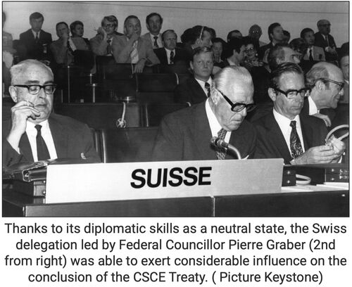 And specifically for the neutral countries: “The conference and the Final Act strengthened the position of small states and neutrals. They have become a factor that must be reckoned with—not militarily, but politically. For the future, the task is to maintain this position.” This position, according to Bindschedler, should be used particularly for “peaceful dispute settlement”. He ultimately described the role of neutral Switzerland as a diplomatic great power: