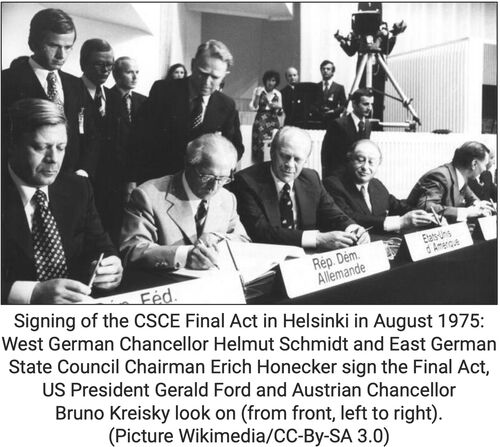 It should be noted that neutral Switzerland, with its quiet behind-the-scenes diplomacy, continuously played a significant role. Together with the other neutrals—Austria, Sweden, and Finland—it provided important mediation services, thereby strengthening the entire process. From 1974, it also did so in association with non-aligned Yugoslavia and the small states of Cyprus, Malta, San Marino, and Liechtenstein as the “Group of N+N,” the “Neutrals and Non-Aligned.”