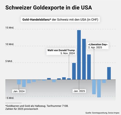 The main cause of Switzerland’s increasing exports to the US, which had been visible before but blatantly ignored, was overlooked, namely the explosion in gold exports. These had tripled since Donald Trump’s election and reached a staggering 476 tonnes of gold bars in the first half of 2025.
